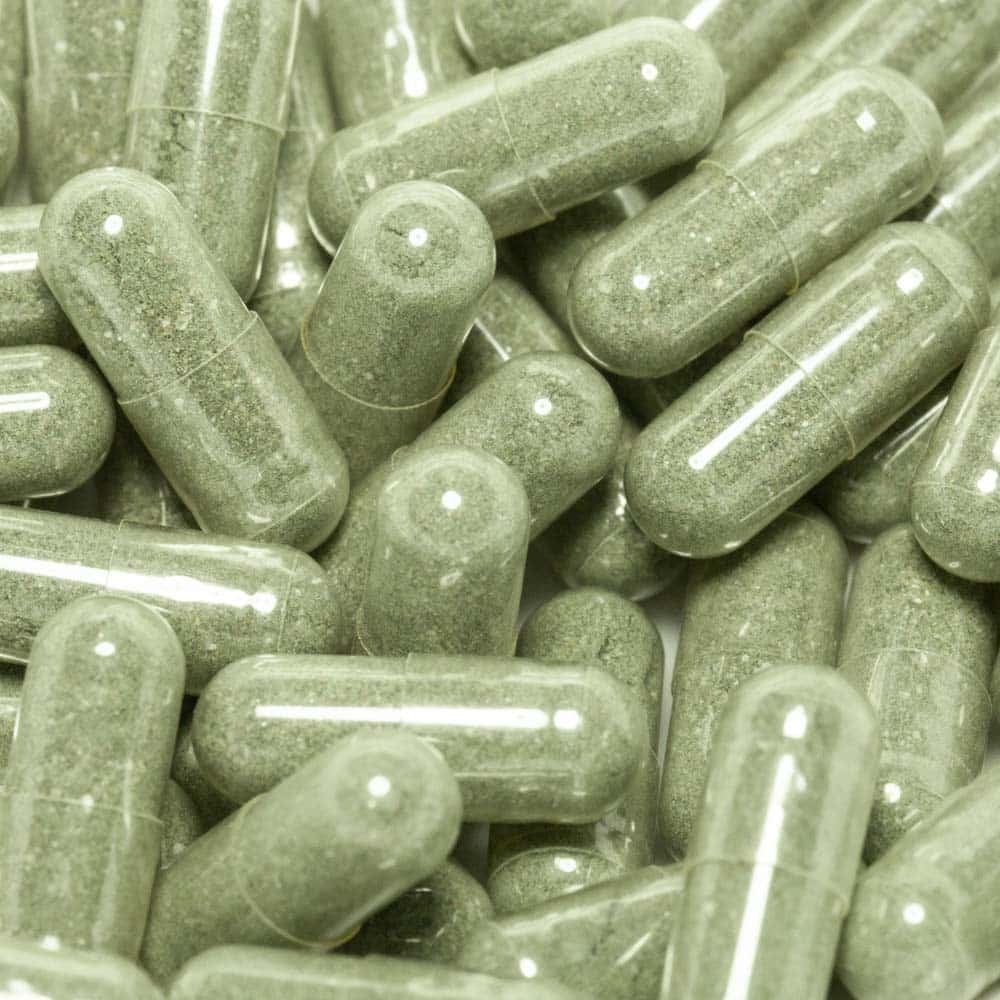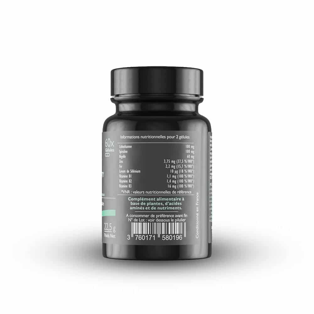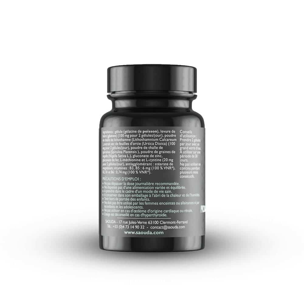 Ingrédients : Gélule (gélatine de poisson), levure de bière (gluten) , poudre de thalle de lithothamne (Lithothamnium calcareum ), poudre de thalle de spiruline (Spirulina platensis ), extrait sec de feuilles d’ortie (Urtica dioica ), oudre de graines de nigelle (Nigella sativa ), gluconate de zinc, gluconate de fer, L-méthionine, L-cystine, antiagglomérant : stéarate de
