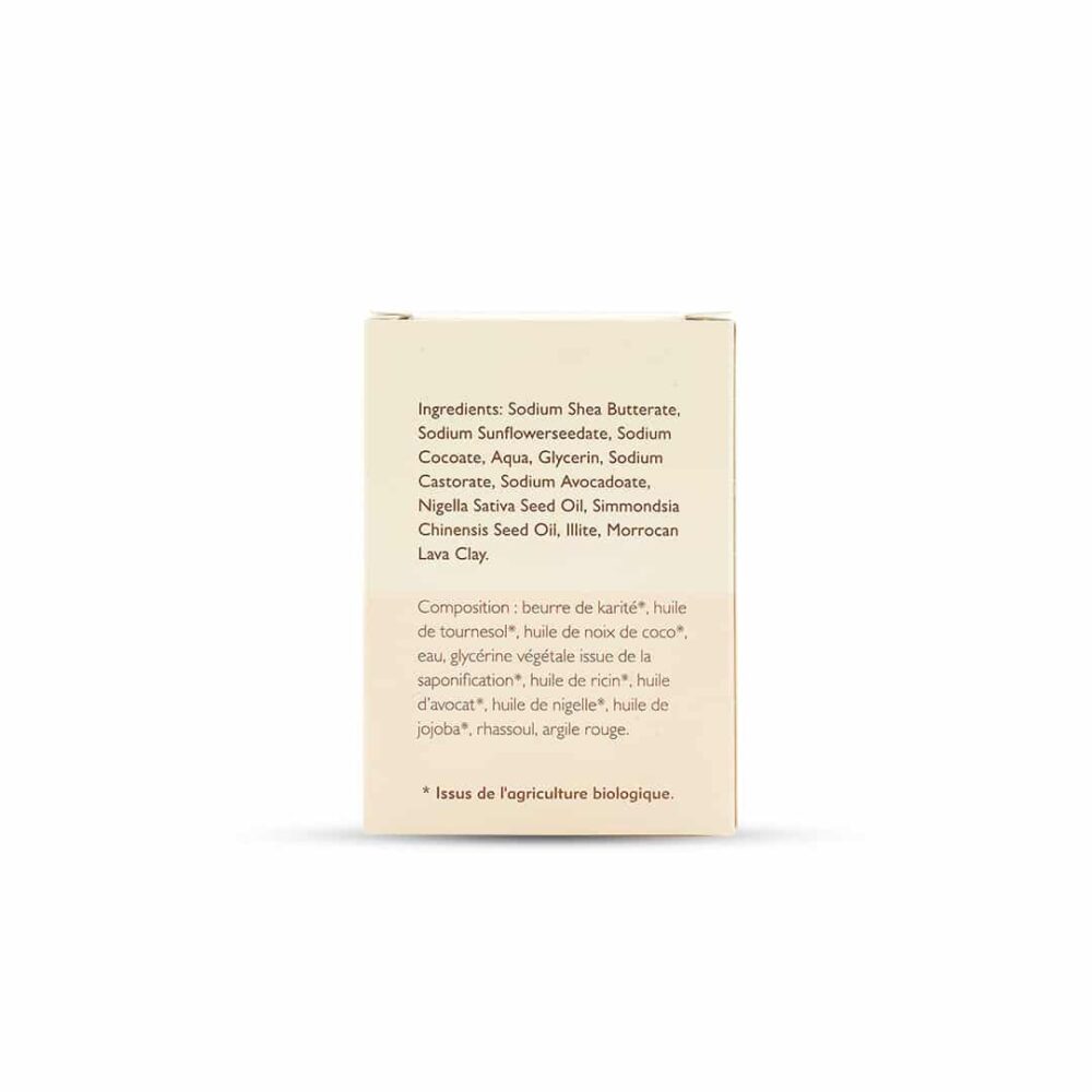 INCI : Sodium Shea Butterate, Sodium Sunflower Seeds, Sodium Cocoate, Aqua, Glycerin, Sodium Castorate, Sodium Avocadoate, Nigella Sativa Seed Oil, Simmondsia Chinensis Seed Oil, Illite, Morrocan Lava Clay.